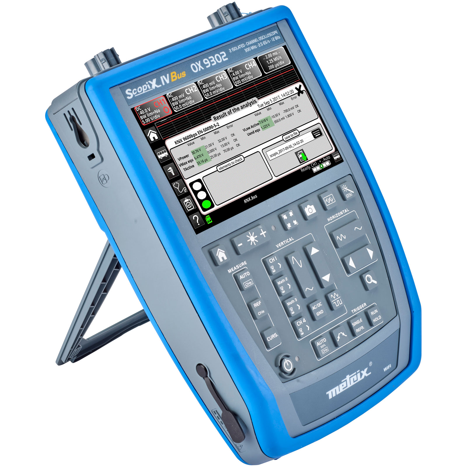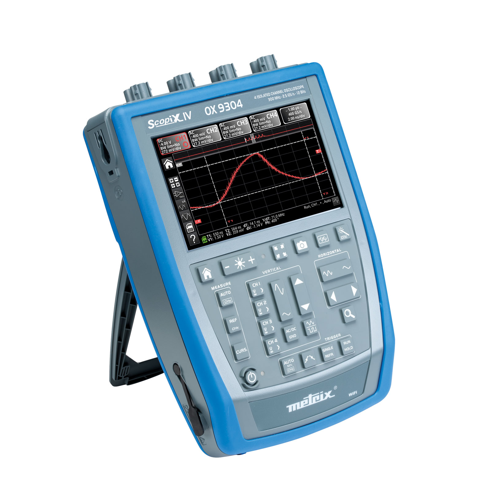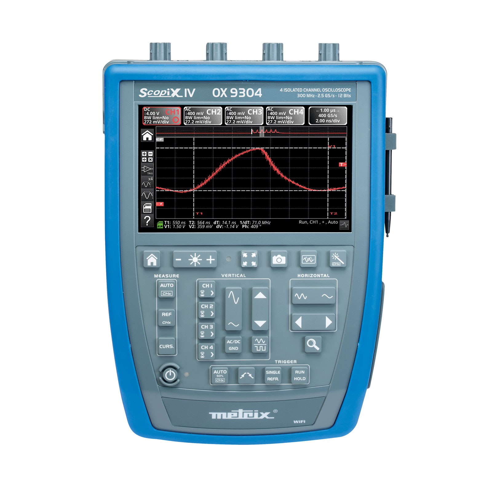 A portable, stand-alone oscilloscope with 4 totally-isolated 600 V channels and 300 MHz bandwidth. The instrumant contains a memory depth of 100 kpoints per channel which considerably increases the available recording duration.