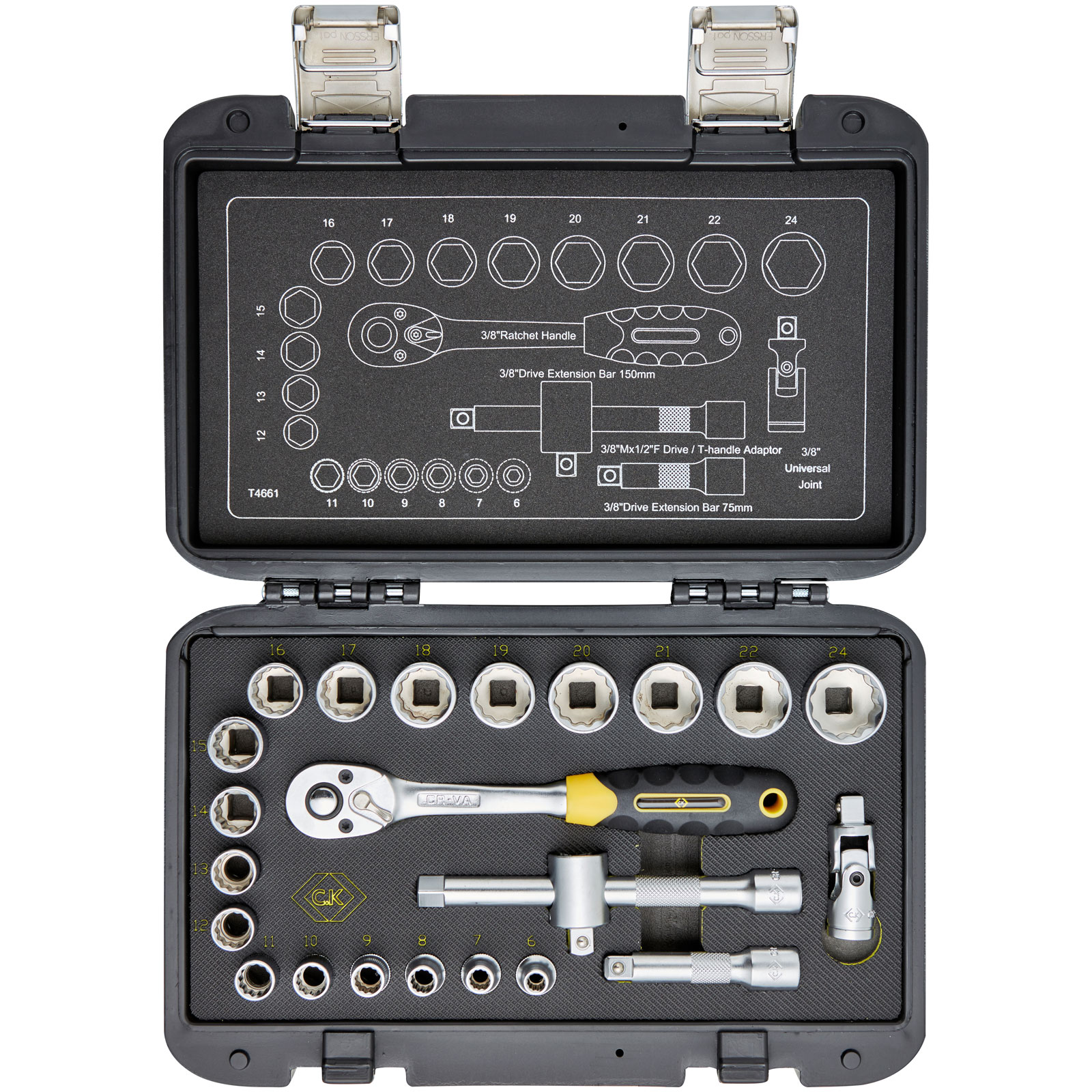 Heavy duty rust resistant, chrome vanadium construction 23 piece 3/8" socket and bit set, with reversible 72-teeth ratchet mechanism, for fine adjustment in confined spaces.