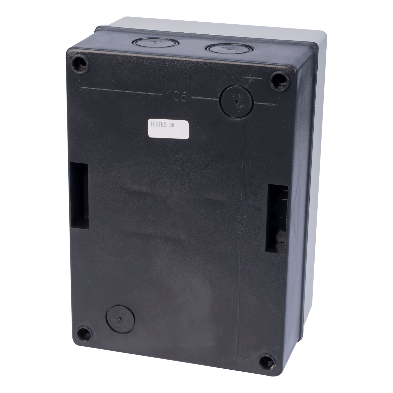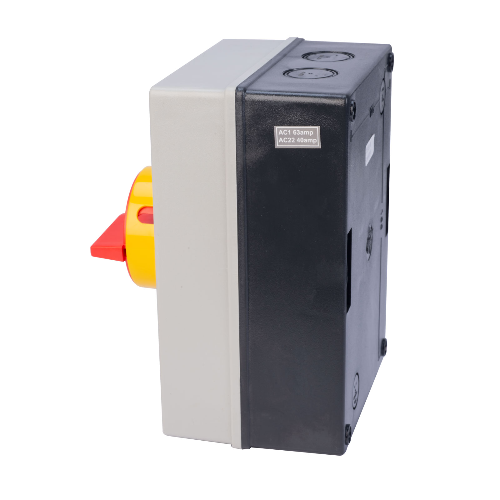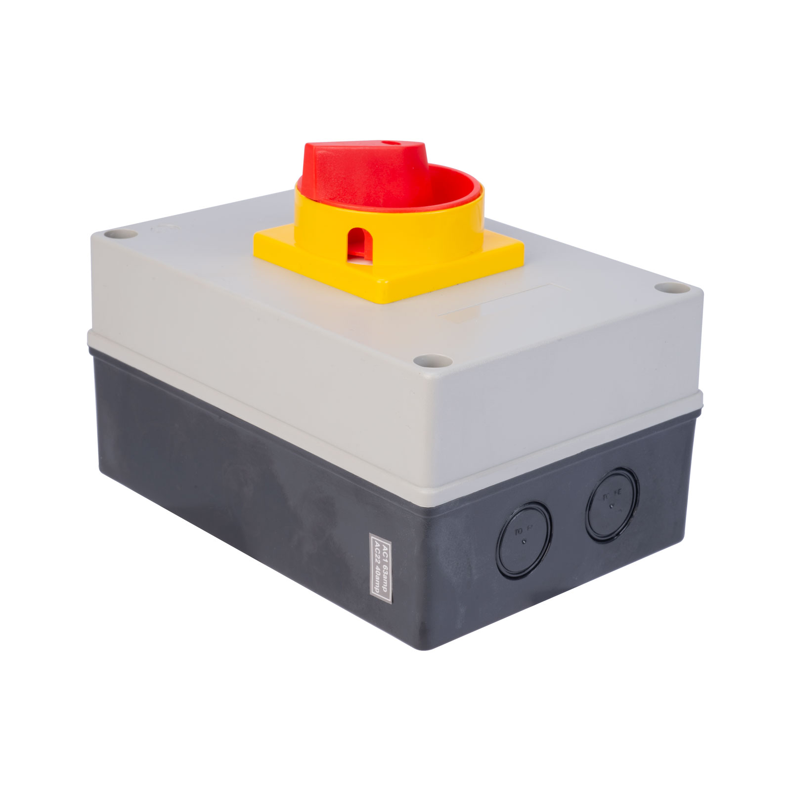 The Garo SS 440 40A safety switch is an IP65 rated, 4 Pole Rotary Isolator Switch is in a grey enclosed polycarbonate body.