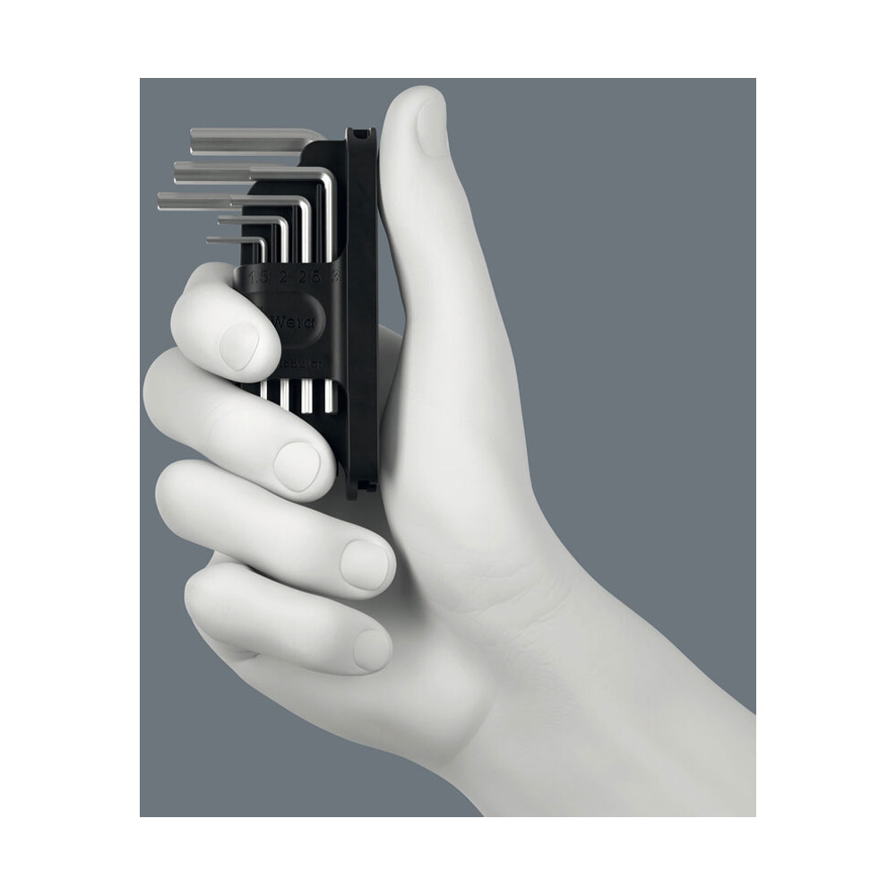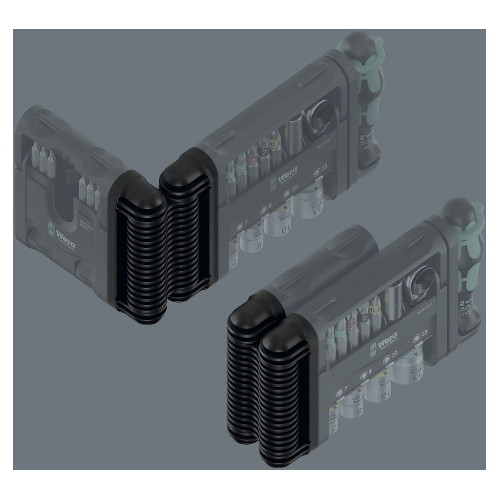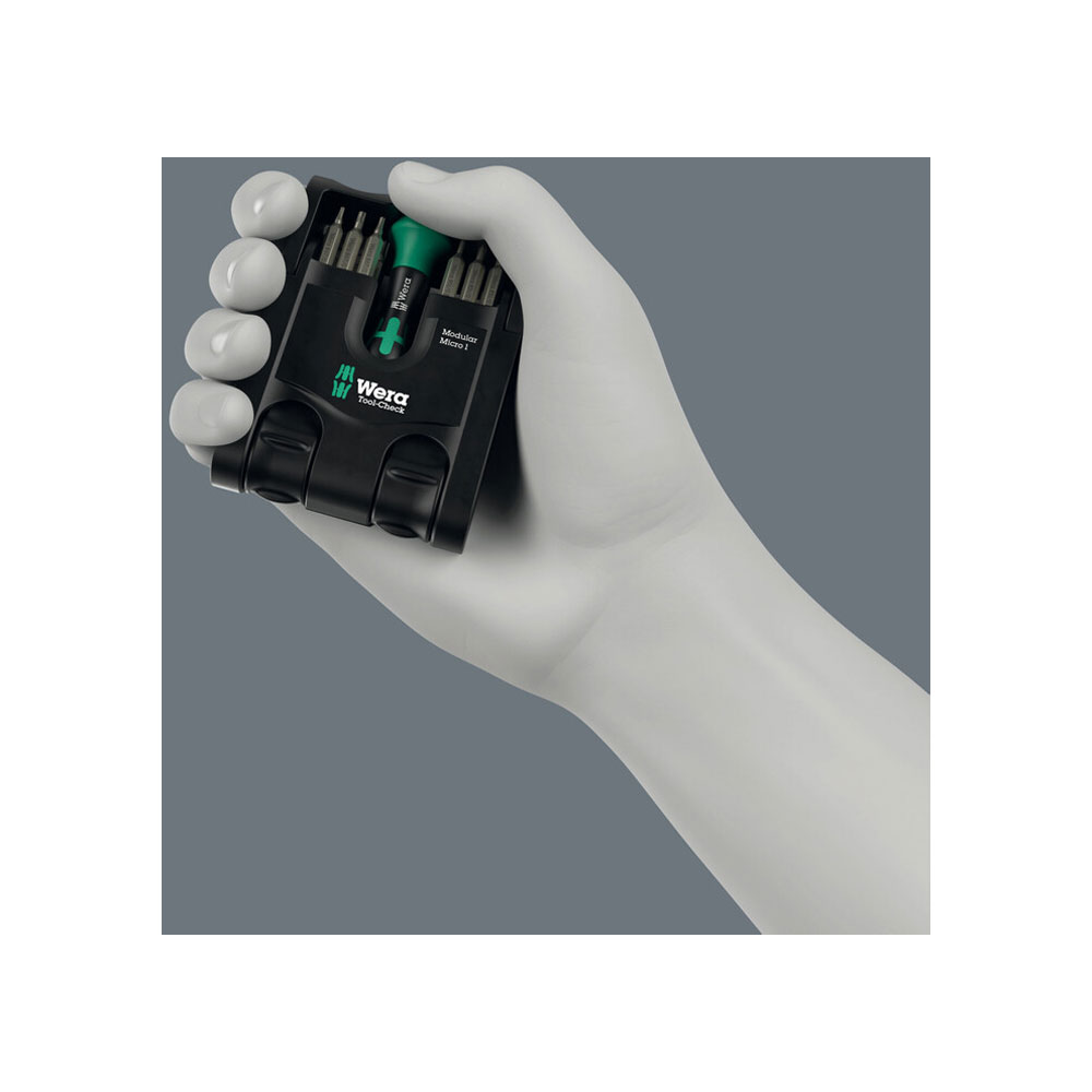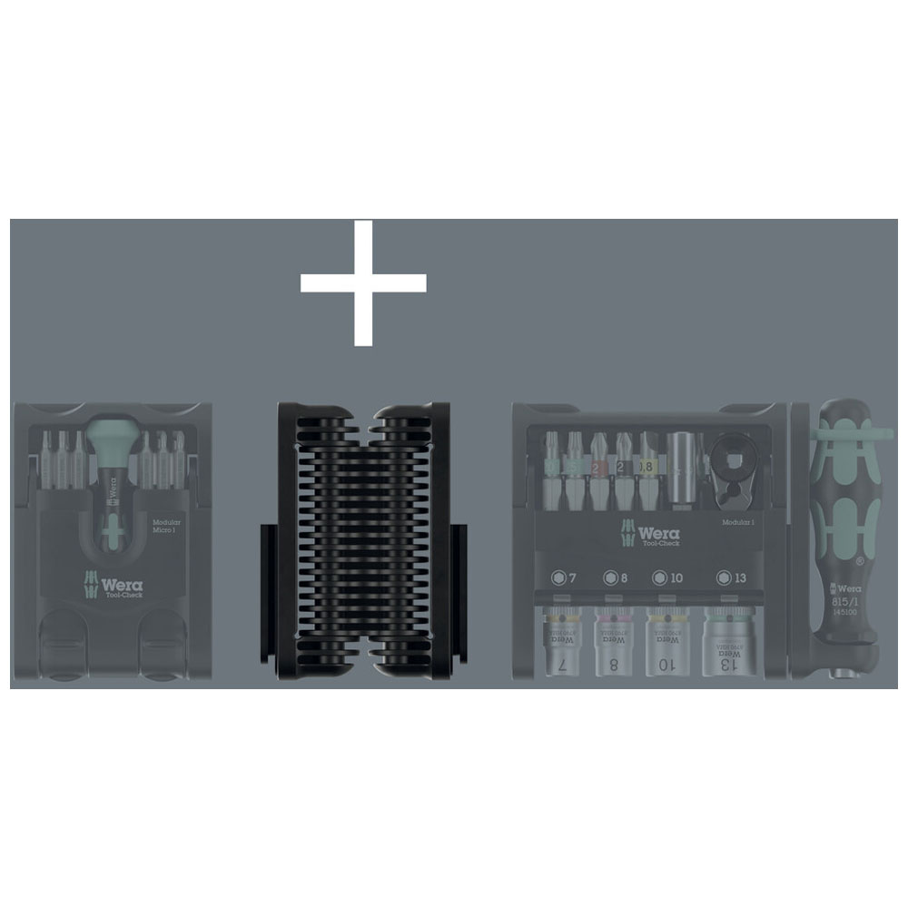 Very compact tool set: Tool-Check Modular Set 1. Includes: one Tool-Check Modular 1, one Tool-Check Modular Micro 1, one Tool-Check Modular L-key Hex-Plus 1, one adapter 9549 and one flexible hinge 9550 (adapter and hinge for connecting Tool-Check Modular products).