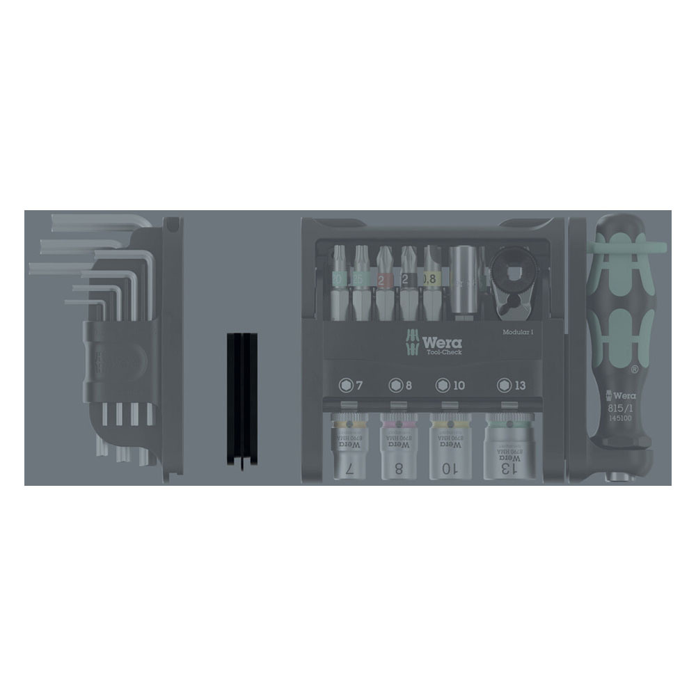 • Includes: one Tool-Check Modular 1, one Tool-Check Modular Micro 1, one Tool-Check Modular L-key Hex-Plus 1, one adapter 9549 and one flexible hinge 9550 (adapter and hinge for connecting Tool-Check Modular products)